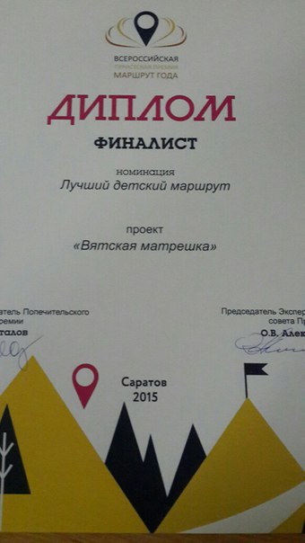 7. Финал Всероссийской туристской премии «Маршрут года» в г. Саратов 30 октября - 01 ноября 2015 г. Презентация проекта "Вятская матрешка" в номинации Лучший детский маршрут 2015.